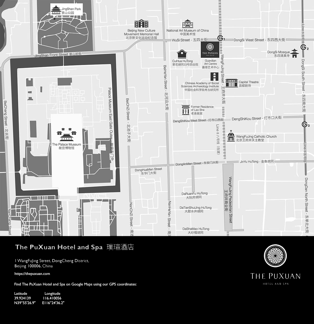 The PuXuan Hotel and Spa is located approximately 25 kilometres from Beijing Capital International Airport, a 40-minute drive and 53 kilometres from Beijing Daxing International Airport, a 60-minute drive.